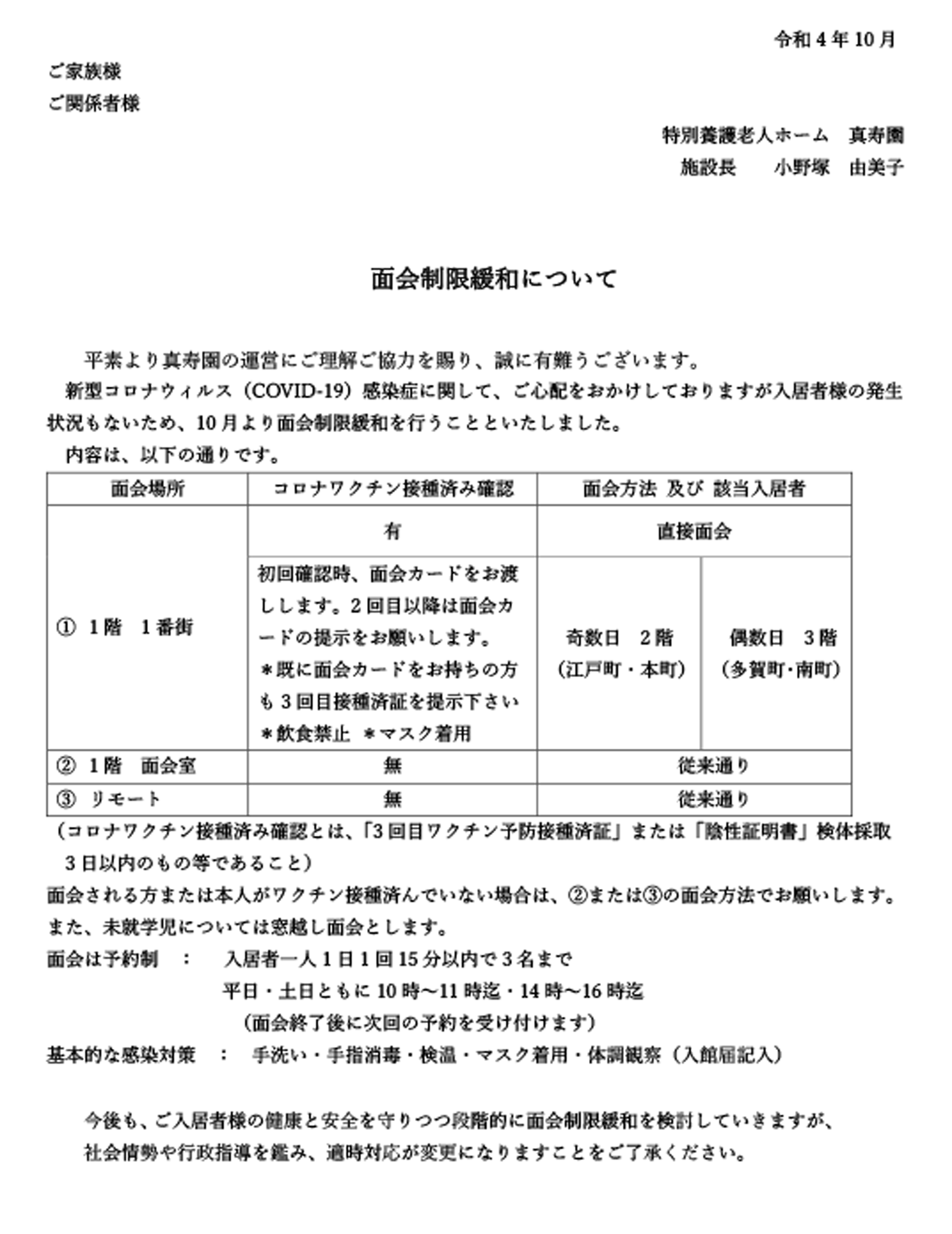 ⾯会制限緩和について